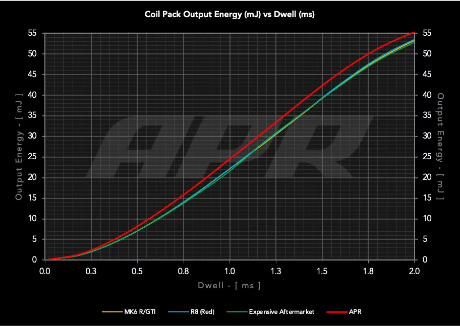 Las bobinas de encendido APR están diseñadas para ser una actualización directa plug-and-play de las bobinas de fábrica y proporcionar una mayor salida de energía, lo que garantiza una chispa más fuerte y más consistente. Se cree popularmente que el reemplazo habitual de las bobinas de encendido de fábrica con las tomadas del Audi R8 de mayor potencia proporciona una mayor salida de energía. Sin embargo, las pruebas demuestran que no son más potentes que las bobinas de fábrica que se encuentran en otros motores. Las bobinas de encendido APR aumentan la salida de energía hasta en un 10% con respecto a las de fábrica. Son una actualización o reemplazo directo y vienen con una carcasa roja única.