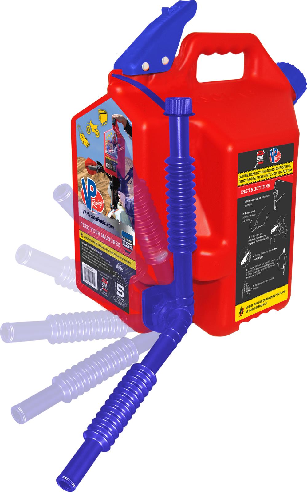 Los bidones utilitarios VP Racing SureCan son los más innovadores del mercado. Gracias a su tecnología patentada a prueba de derrames, ya no tendrás que agacharte para volcar el bidón ni mancharte las manos de gasolina. Cuentan con una boquilla giratoria y un gatillo de liberación con el pulgar que permite que el combustible se dispense desde la parte inferior, ¡para que la gravedad haga todo el trabajo! Otras características incluyen ventilación automática, un agarre cómodo y un diseño resistente.